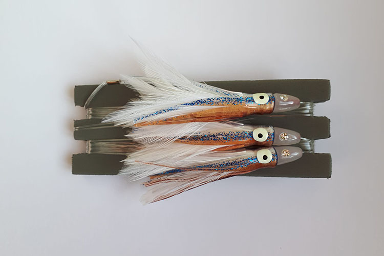 Todos los señuelos están montados con tres brazas de hilo de 0,70mm de diámetro, excepto los modelos 5001B, 5001A, 6001B, 6001A, 6001R, 6002L, 6002R y 6003R (con tres brazas de hilo de 0,80mm de diámetro), y en el anzuelo montado con una anilla de acero inox. Acabado en tres vueltas (para dar opción a cambiar el modelo de anzuelo)